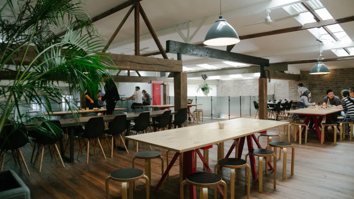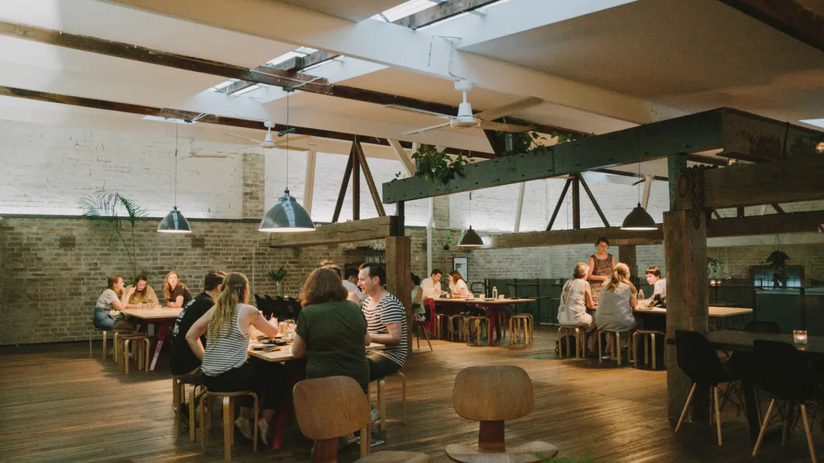 An intimate dining room paired with a working motorcycle workshop — unexpected, warm, and unmistakably RSW.